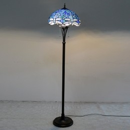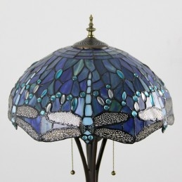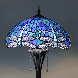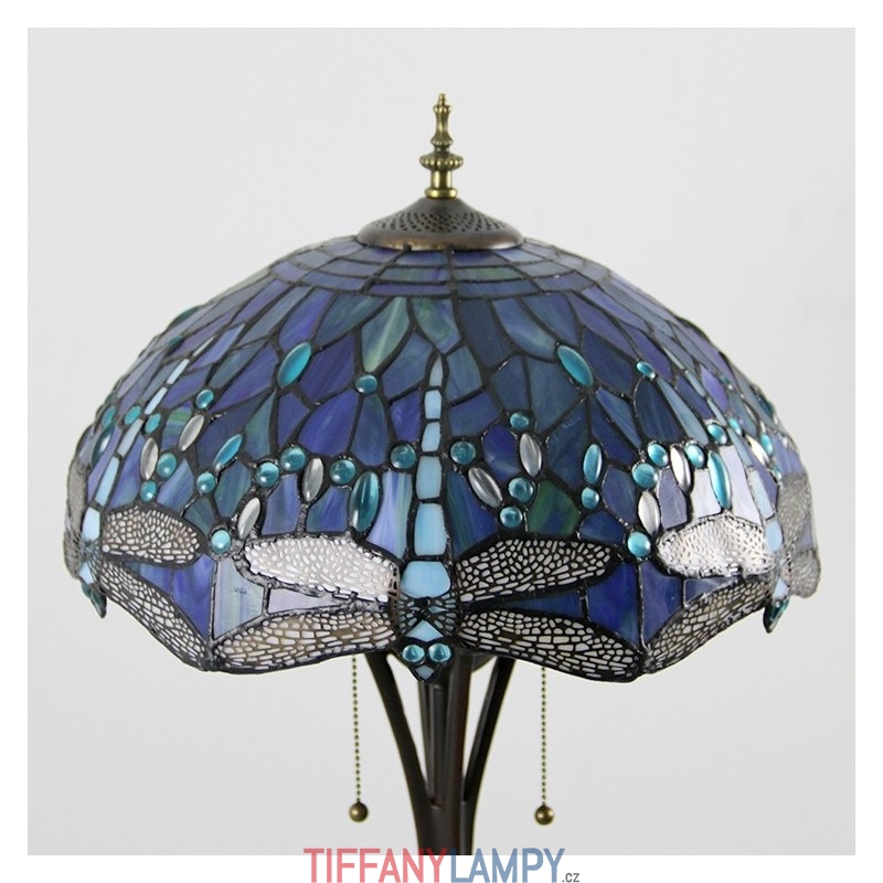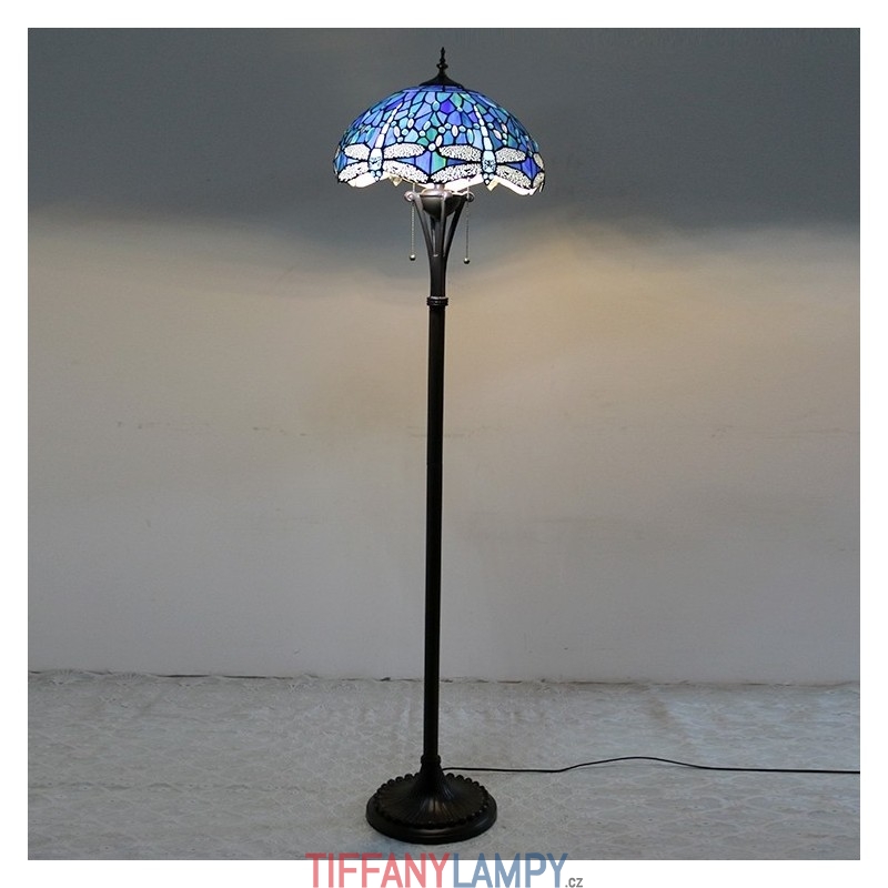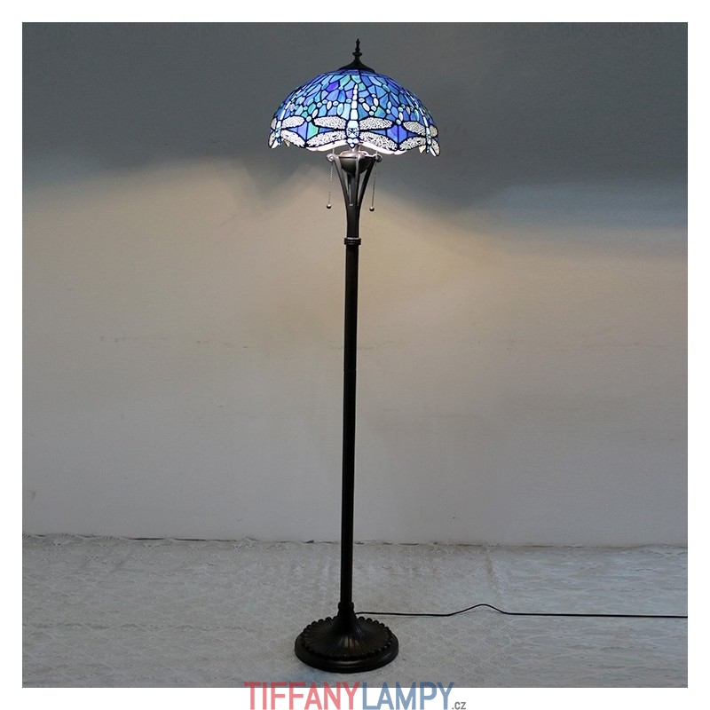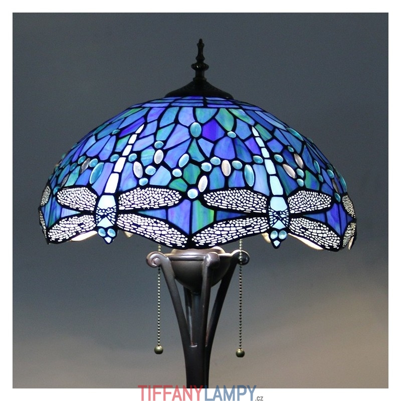Světle modrá stojací lampa z barevného skla Dragonfly ve stylu Tiffany s 16palcovým ručně vyráběným kovovým lampovým podstavcem
